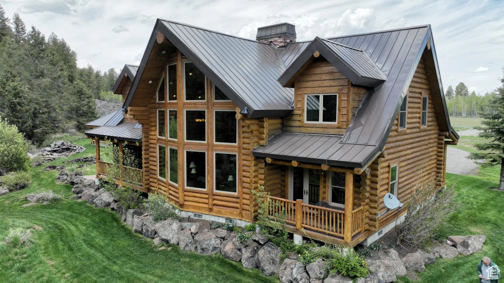 Fully Furnished Custom-Built Log Cabin Near Blackfoot Reservoir - Year-round county paved road access - 3,466 +/- square feet, 5 bedroom, 3 1/2 bath custom-built log cabin built 2013-2014 - Overhead power will be pulled to the property replacing the off-the-grid capability - Inverter will be installed for 4 solar panels to backfeed grid - Deep bay 54' x 34' workshop with 2 RV doors  - 22' x 36' Detached garage will be leveled and not be rebuilt - Screwless metal roof replaced in 2024 - 2 efficient stone wood burning fireplaces with abundant firewood included - Mountain Land KitchenAid stainless steel appliances, gourmet Wolf range and Sub-Zero refrigerator freezer - Solid wood handcrafted Amish furniture, gun safe, pool table, Traeger smoker, and Weber grill - Thick granite countertops and backsplash - Slate shower and tub surrounds - Flooring: Rough cut finish walnut, slate, stone, and carpet - 3 Pressurized accumulator tanks, water softener, and tankless hot water heater - 110v hot tub on upper-level covered deck - 34+/- acres west of Government Damn Road will be split off 80-acre parcel prior to closing -- Tucked in the tall evergreens near Blackfoot Reservoir, this fully furnished custom-built log home, the Coeur d'Alene, with tongue and groove construction, offers a turnkey high-country retreat or year-round residence. With handcrafted solid wood Amish furniture throughout, this beautifully appointed, 3,466 +/- square foot, five-bedroom, three-and-a-half bath cabin built in 2014 currently sits on eighty acres with a detached garage and shop. Overhead power will be pulled to the property this fall, replacing the off-the-grid capability, and an inverter will be installed in the deep bay workshop to allow the solar panels to backfeed the grid. This could provide credits on your electricity bill. The landowner will split off this homestead of approximately thirty-four acres of ground west of Government Dam Road prior to closing.  The open floor plan with vaulted ceilings and natural light streaming in through the many expansive windows creates a welcoming glow against the warm wood beams and beautiful, rough-cut finish walnut hardwood flooring throughout. In the fall, the lush evergreen carpeted ridge is particularly vibrant against the golden leaves and white trunks of the aspens. Painted kitchen cabinets and coordinating backsplash provide a fresh, contemporary vibe, and the decorative ceiling logs are the perfect accent to meld the two. Boasting Mountain Land KitchenAid stainless steel appliances, a gourmet Wolf range, and a Sub-Zero refrigerator freezer, thick granite countertops with rough edge finish, and backsplash throughout the home. Slate tub and shower surrounds are complemented by slate and stone flooring in the bathrooms and carpet in the upstairs bedrooms. The master bath subfloor is heated for added comfort. At the end of the day, enjoy a nice, relaxing soak in the clawfoot tub and curl up by one of the wood-burning fireplaces with a good book.  The 54' x 34' deep bay workshop with two RV doors provides plenty of room to park and store your vehicles, RV, boat, and ATVs, and work on projects at your leisure, and the asphalt driveway offers ample parking to accommodate your guests' vehicles. Two efficient and reinforced stone wood-burning fireplaces are focal points and poised for heavy mounts to be hung securely. Abundant firewood is stacked inside the shop and at your disposal.  Experience the serenity of the outdoors year-round on the covered decks and fireside pavilion picnic area. The main level covered front porch is the full length of the cabin and provides two separate entrances and ample space for greeting guests and seating. The covered deck off the kitchen is plumbed for propane and equipped with a Weber grill and Traeger smoker. Enjoy a little peace and possibly wildlife viewing on the master bedroom deck. A 110-volt hot tub and outdoor furniture await on the upper-level covered deck