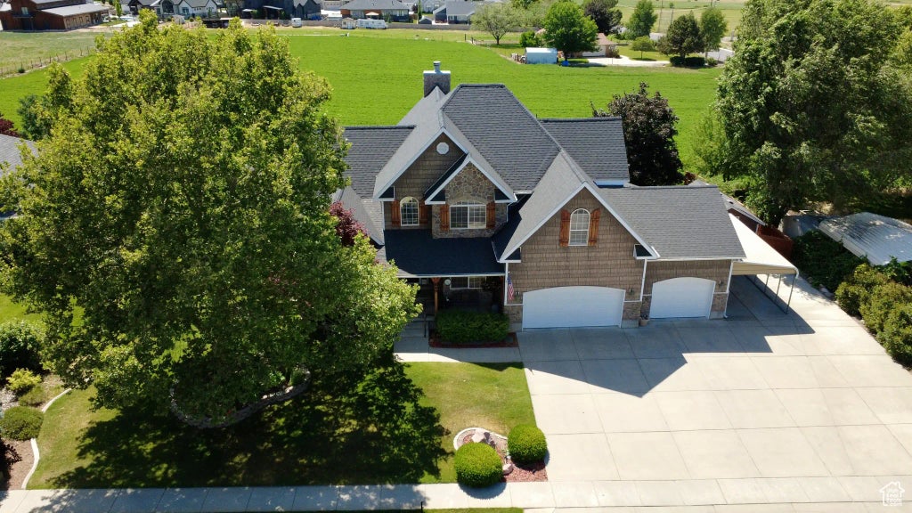 Stunning Custom Home on a Quiet Cul-de-Sac. Faux shingle siding for a classic, durable look. Recent improvements include a New Roof (2022), New dual-zone A/C and Furnaces (2025) for optimal climate control, as well as New Garage Doors, a Double Oven Stove, and Dishwasher (2025). Step inside to a spacious Great Room featuring a striking stone fireplace, perfect for cozy evenings. The knotty pine ceiling with exposed beams adds warmth and rustic charm to the family room and kitchen, creating a truly inviting space. The generously sized primary suite includes its own fireplace, a private patio with a hot tub, and a bathroom complete with a jetted tub. Additional highlights include: 3-car attached garage with 220V power, attached carport, and RV dump. Backyard retreat with covered patio, fire pit area, water feature, natural gas grill hookup, and a cute playhouse for kids. Backs up to open alfalfa field-no rear neighbors! Located just down the road from Salem Pond and Cole's Park, where you'll find a splash pad, pickleball courts, and a playground-making this the ideal location for both relaxation and recreation.
