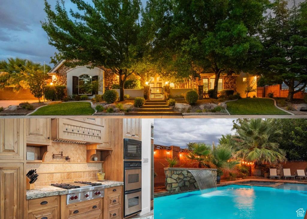 Beautiful home located in the quiet and secluded Cox Landing neighborhood near the heart of St George. The gourmet kitchen features high-end custom cabinetry, thick granite countertops, a gas cooktop with a wood hood and pot filler, and wall ovens. The spacious primary suite offers a roll-in steam shower with double shower heads, jetted tub, and a large walk-in closet with a stackable washer/dryer. The studio ADU has an exterior door, vaulted ceilings, a kitchenette, full bath, and a walk-in closet. Enjoy multiple gathering spaces, including a large basement family room with a kitchenette. The backyard features a saltwater pool with fountain, hot tub, outdoor kitchen with BBQ and TV, gas fire pit, and 2 covered patios surrounded by palm trees and mature landscaping.
